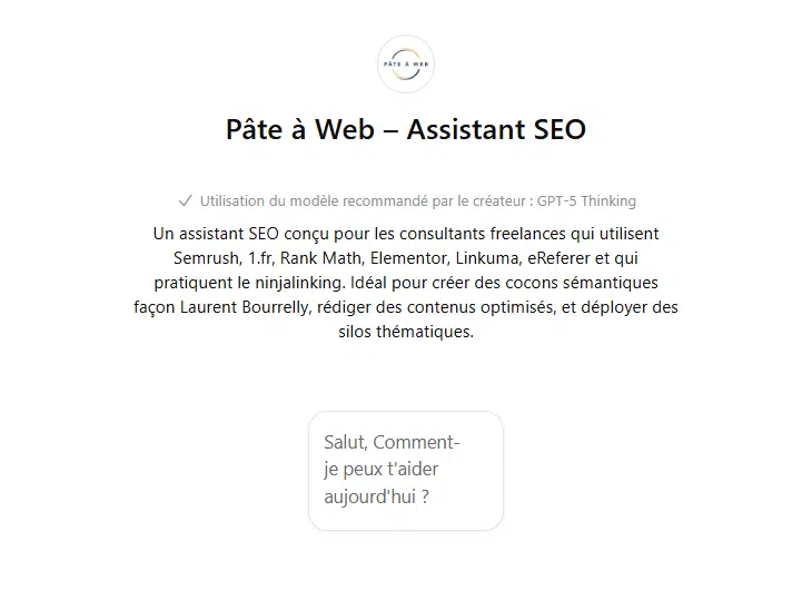 Mon GPT compile mon expertise et m’aide chaque jour à gagner du temps en identifiant les possibilités d’optimisation précises et pertinentes. Ce GPT agit comme un expert SEO qui améliore vos contenus, renforce la structure de vos articles et analyse leur efficacité.